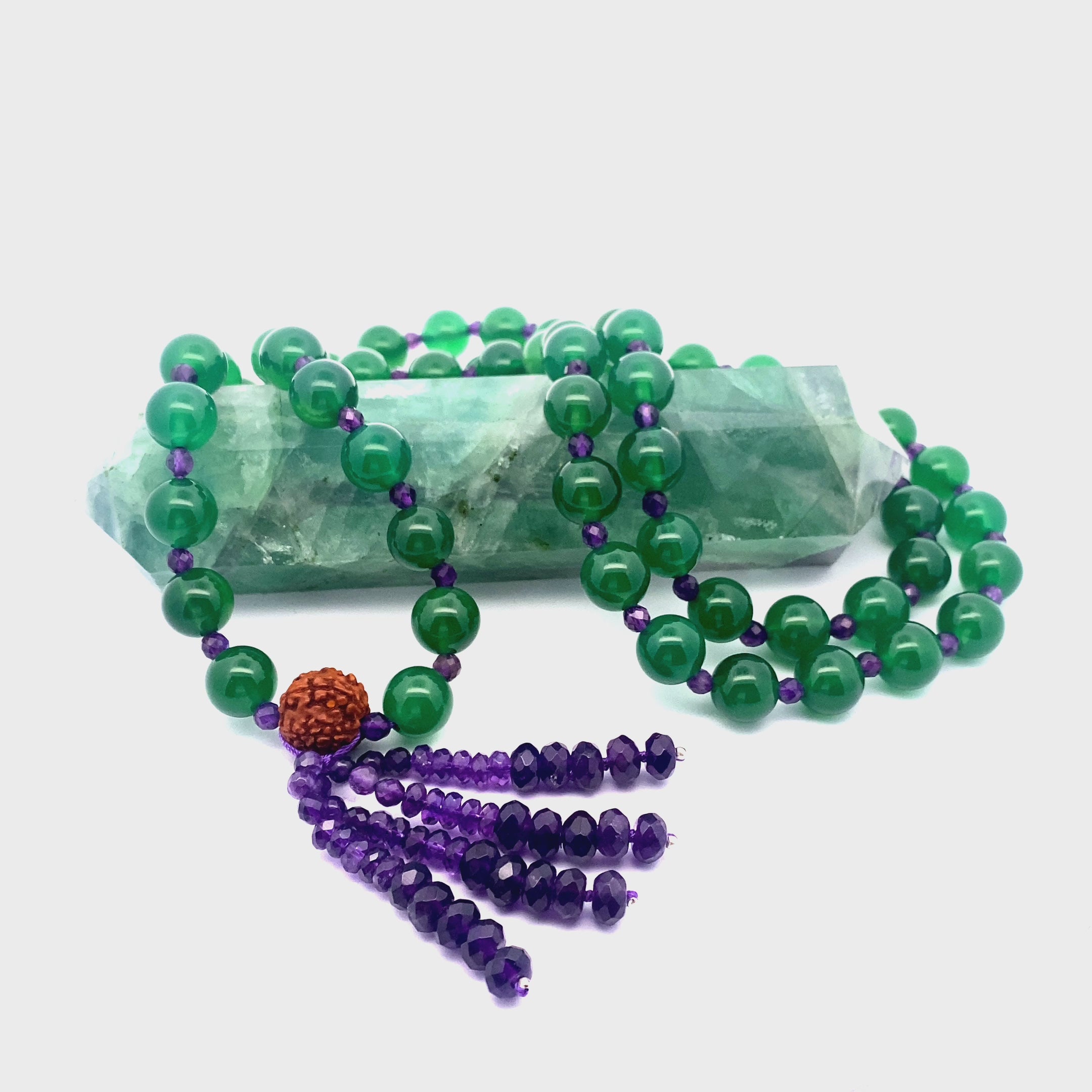 • Gemstones: A high-vibrational combination of Green Agate, Amethyst, and Rudraksha, selected for their ability to enhance intuition, emotional adaptability, and spiritual clarity.