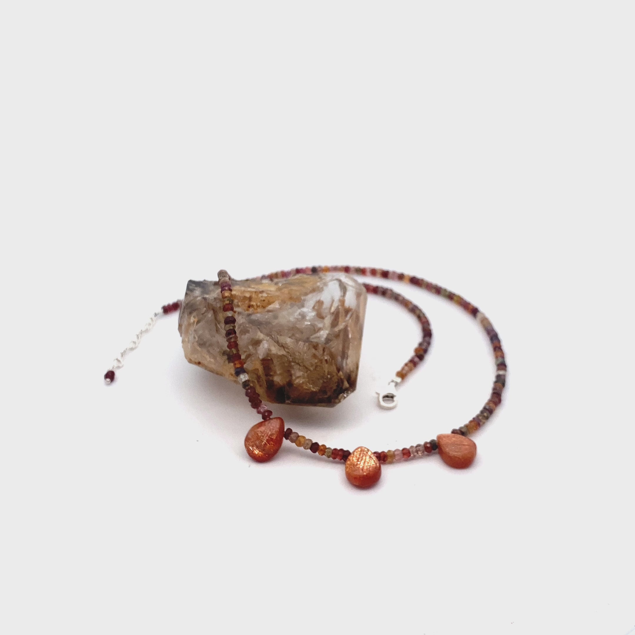 Enhance your sacral and solar plexus chakra with our Bringing Joy necklace, hand crafted with Tundroo Sapphire, Pendant Sunstone for spiritual balance and healing. This short necklace promotes sacral, solar plexus chakra alignment and encourages emotional stability and well-being.
