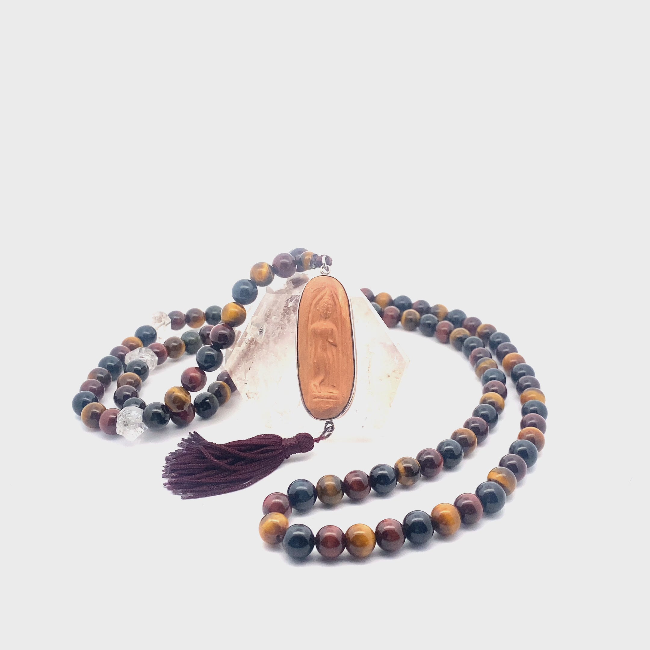 Enhance your solar plexus chakra with our Brings Out Integrity mala, handcrafted with Tiger Eye, Herkimer Diamond, Pendant Buddha Clay for spiritual balance and healing. This mala promotes solar plexus chakra alignment and encourages emotional stability and well-being.
