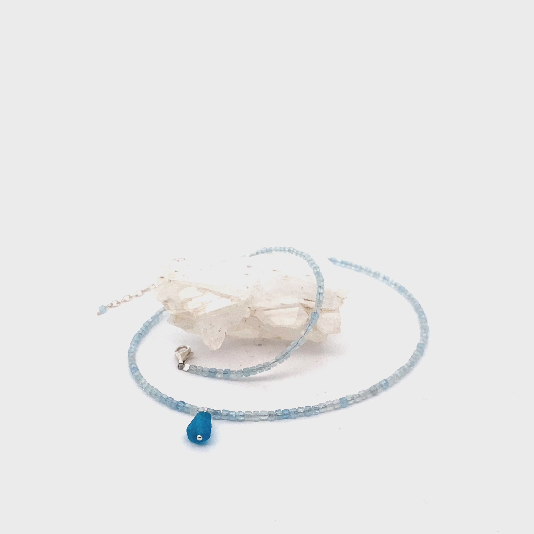 Enhance your throat chakra with our Calms the Mind necklace, handcrafted with Aquamarine, Pendant Blue Apatite for spiritual balance and healing. This short necklace promotes throat chakra alignment and encourages emotional stability and well-being.