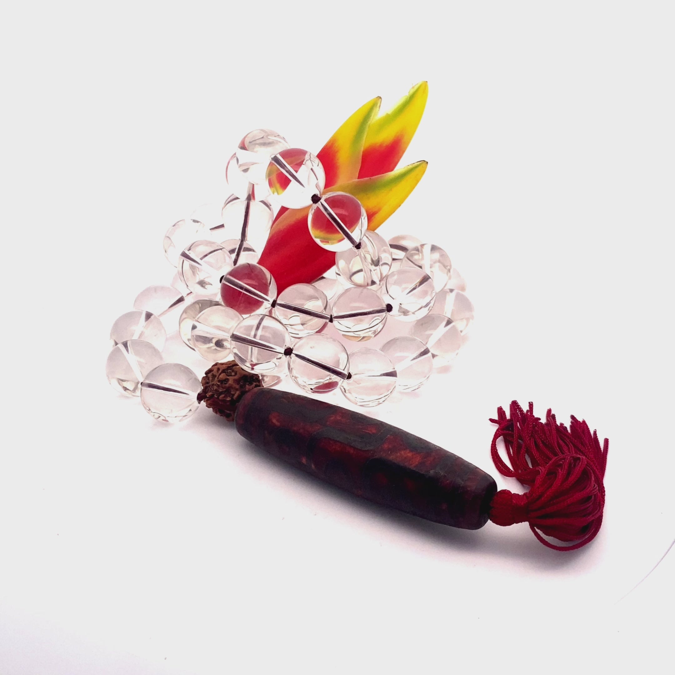 • Gemstones & Materials: A powerful combination of Crystal Clear Quartz, Rudraksha, and an Antique Tibetan Dzi Rice Pendant, chosen for their ability to enhance spiritual awareness, clarity, and self-connection.
