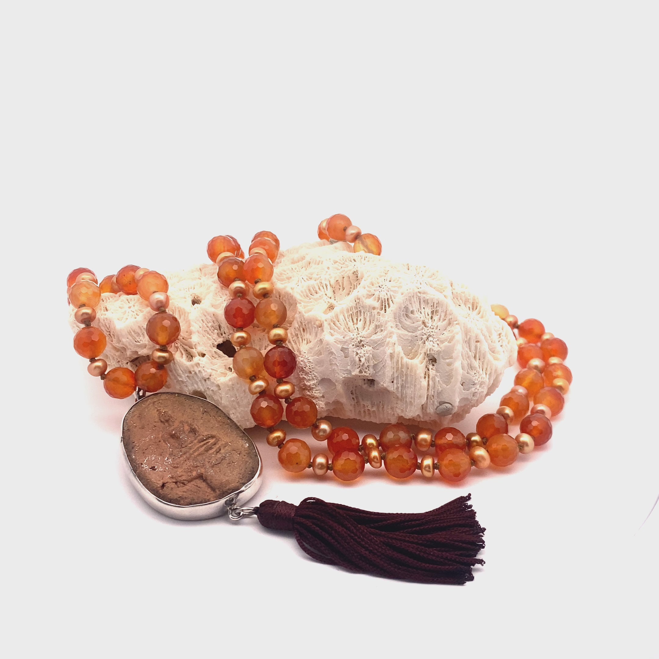 • Gemstones: A high-vibrational combination of Carnelian, Pearls, and a Pendant Buddha Clay bead, each chosen for their ability to stimulate the Sacral Chakra, foster creative expression, and promote emotional balance.