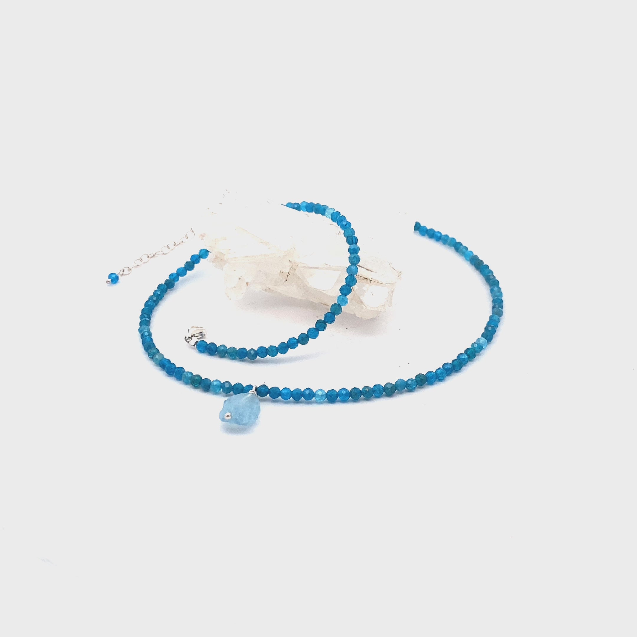 Enhance your throat chakra with our Deepens Meditation necklace, handcrafted with Blue Apatite, Pendant Aquamarine for spiritual balance and healing. This short necklace promotes throat chakra alignment and encourages emotional stability and well-being.