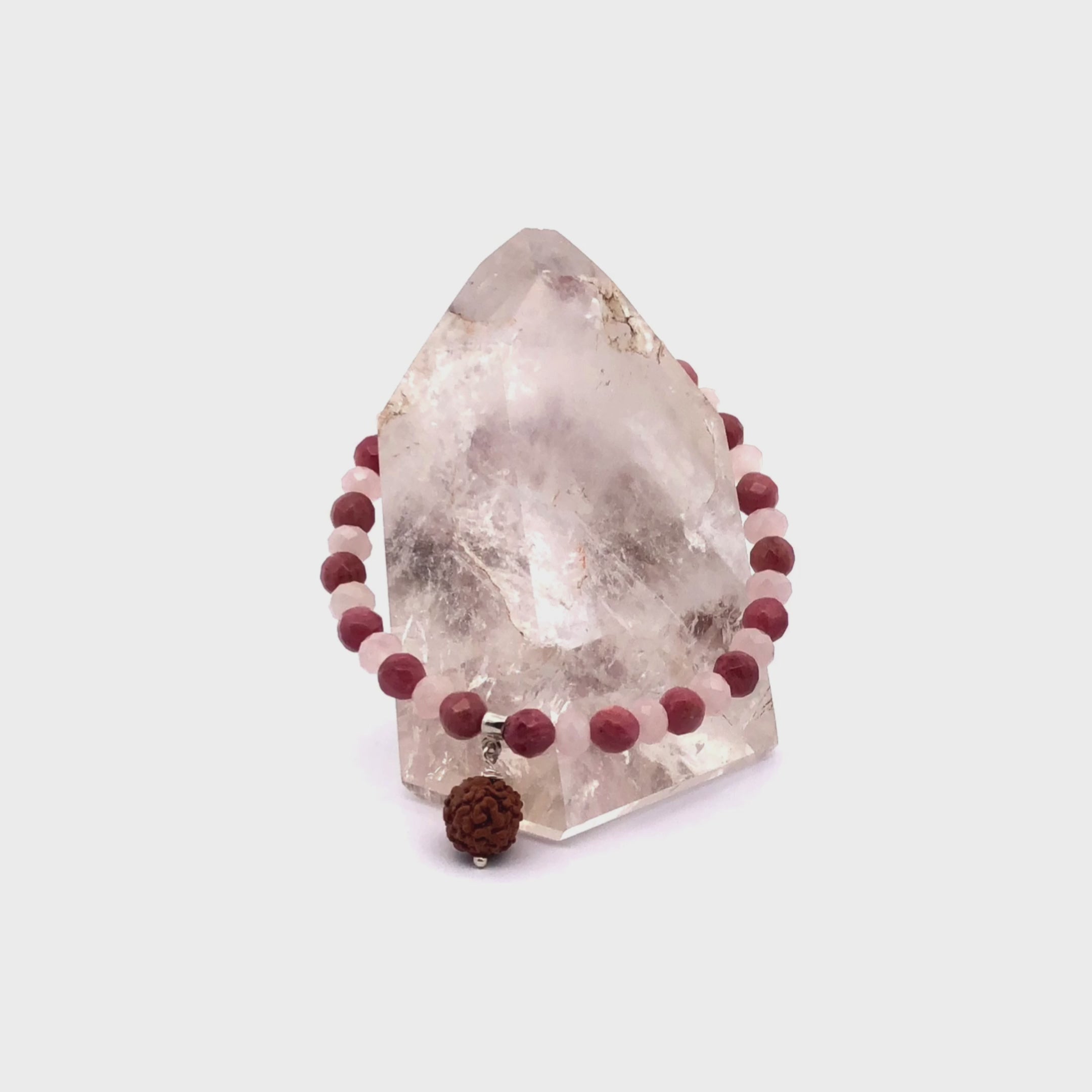 Gemstones: Rose Quartz for love and compassion, Rhodonite for emotional healing, and Rudraksha for grounding and spiritual well-being.
