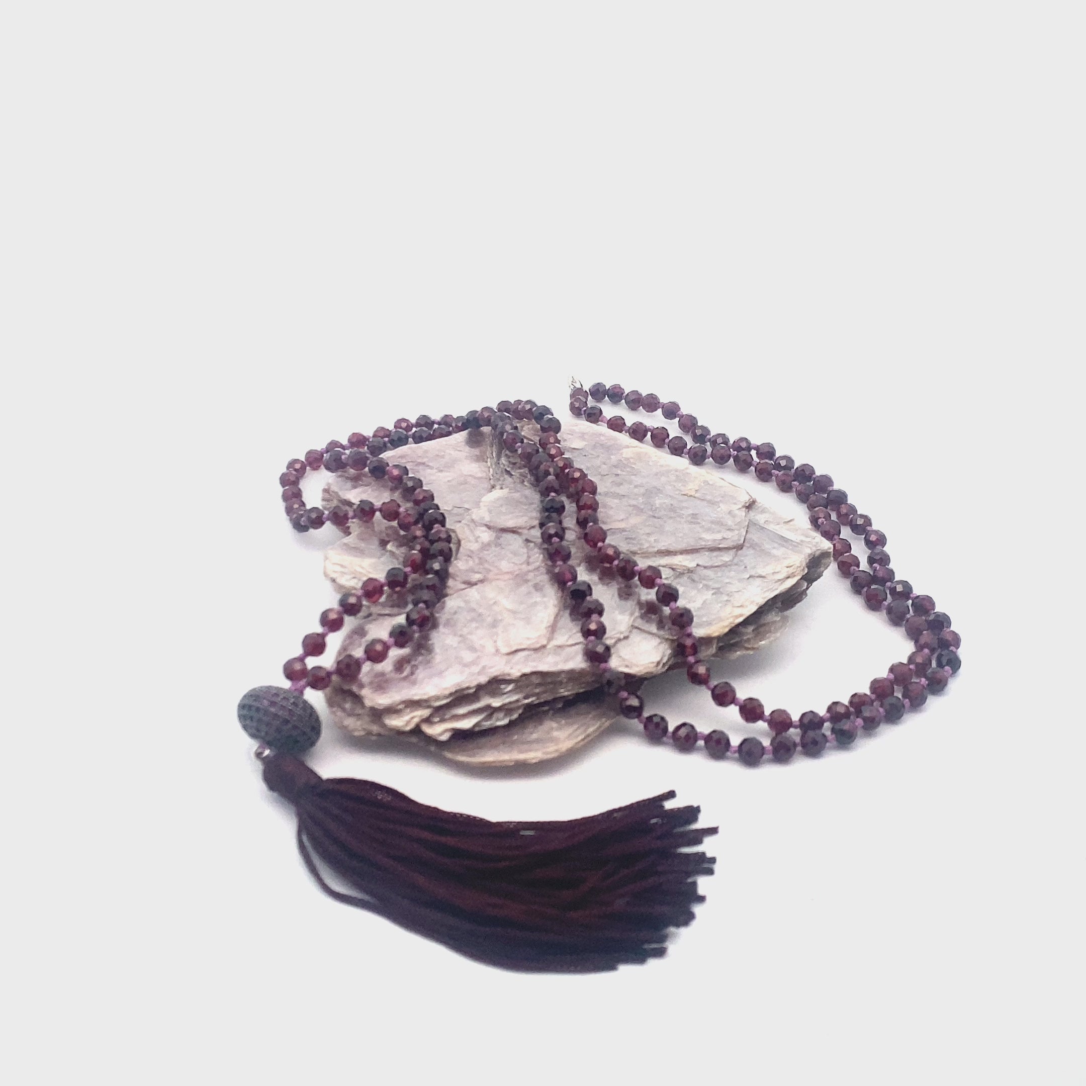 Enhance your root chakra with our Energizer necklace, handcrafted with Purple Garnet, Copper Rondelle, Hot Pink Zircon with Black Plating for spiritual balance and healing. This long necklace promotes root chakra alignment and encourages emotional stability and well-being.