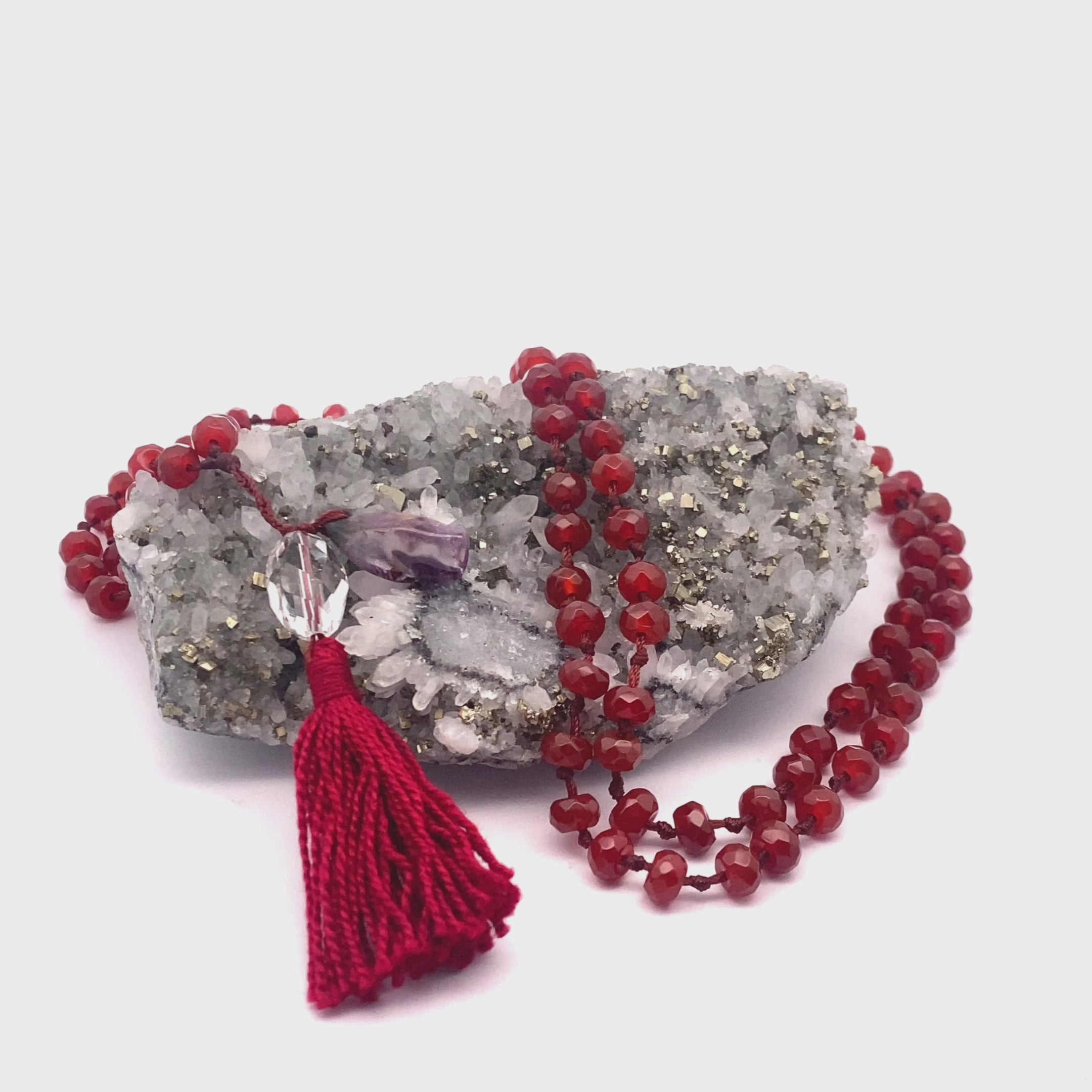 Ignite your inner power and embrace boundless creativity with the Force and Vitality Mala, a masterfully handcrafted accessory designed to activate and balance your Sacral Chakra. Featuring a vibrant blend of Carnelian, Auralite, and Crystal Clear Quartz, this mala is expertly created to clear energy blockages, boost creative expression, and enhance emotional vitality. Strung on durable artificial thread with a tassel, its timeless design seamlessly merges ancient energy practices with modern elegance—making it the perfect companion for meditation, mantra recitation, energy work, or as a meaningful everyday accessory.