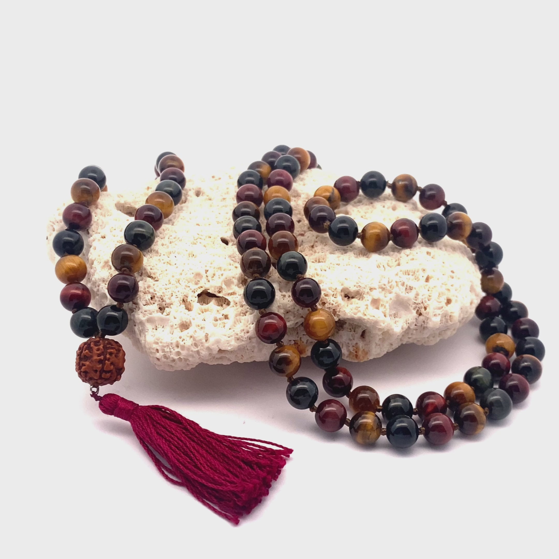 • Gemstones: A high-vibrational pairing of a protective Eye bead and Rudraksha, selected for their ability to activate the Solar Plexus Chakra and promote inner balance and empowerment.