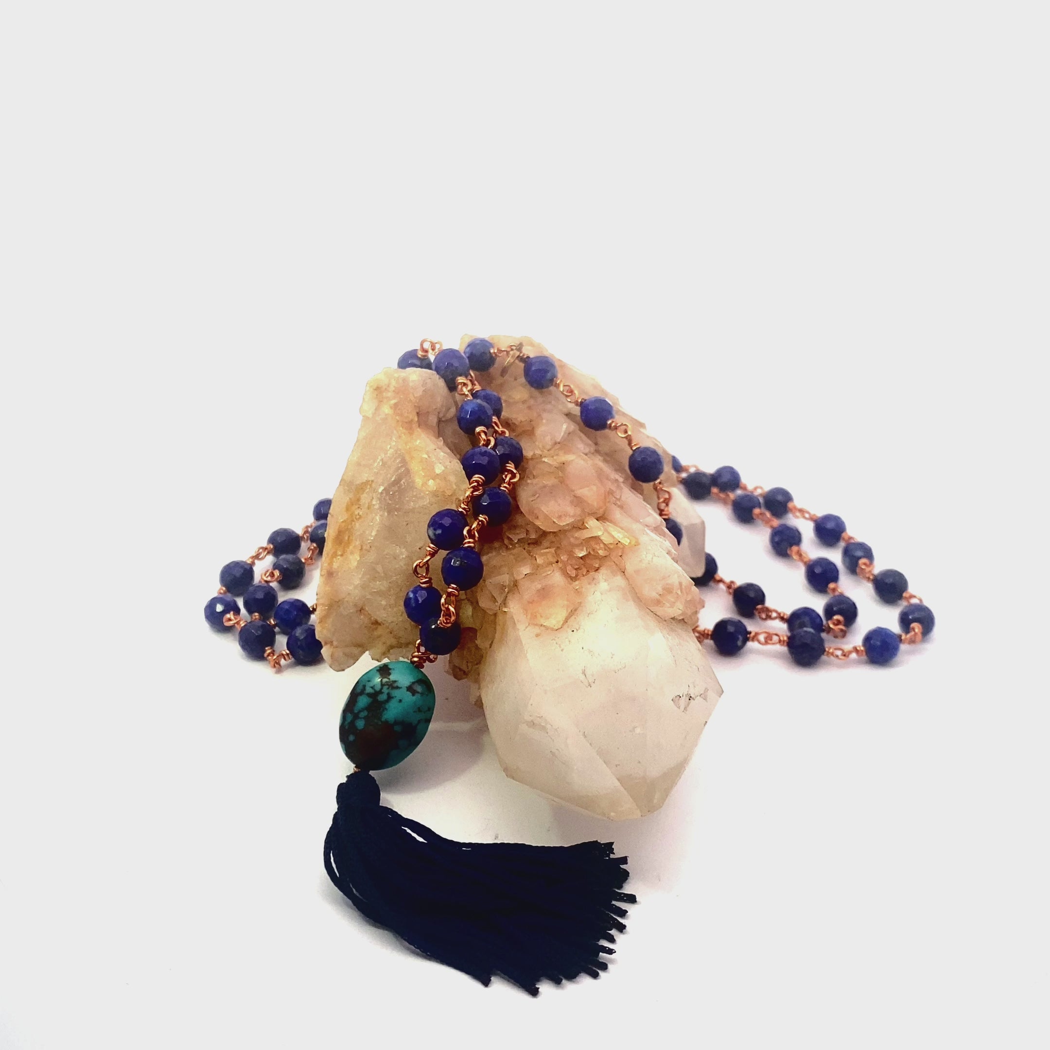 Enhance your inner voice and soothe your spirit with the Harmonizing & Calming Mala, a masterfully handcrafted accessory designed to activate and balance your Throat Chakra. Featuring a harmonious blend of Lapis Lazuli and Turquoise, this mala is expertly created to clear energy blockages, promote clear communication, and nurture a tranquil state of mind. Strung on robust copper wire with a tassel, its timeless design seamlessly merges ancient spiritual wisdom with modern elegance—making it the perfect companion for meditation, energy work, or as a meaningful everyday accessory.