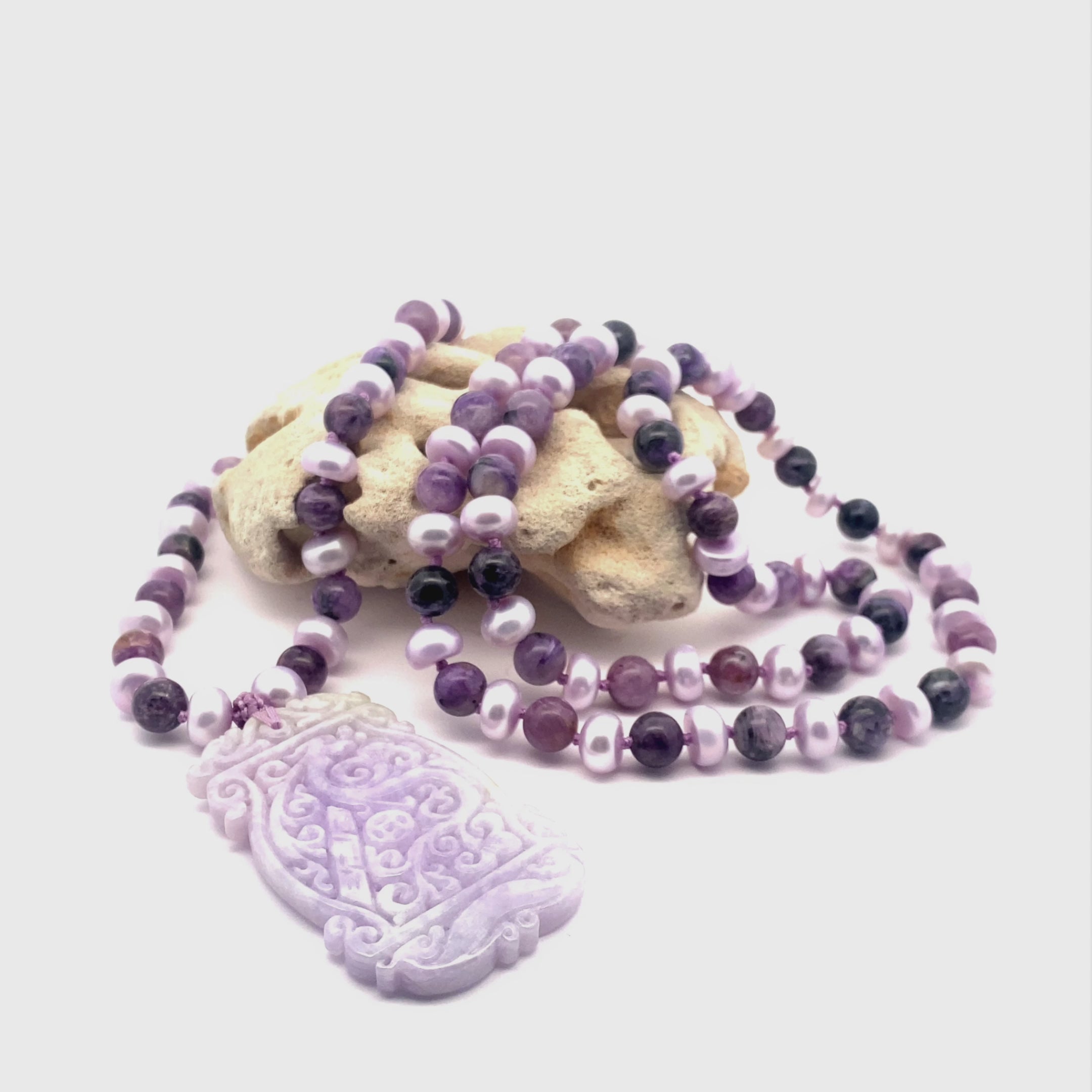 • Gemstones: A high-vibrational combination of Charoite and Pearls, enhanced by a unique Pendant Lavender Jade, each selected for their ability to stimulate the Third Eye Chakra and foster intuitive transformation.