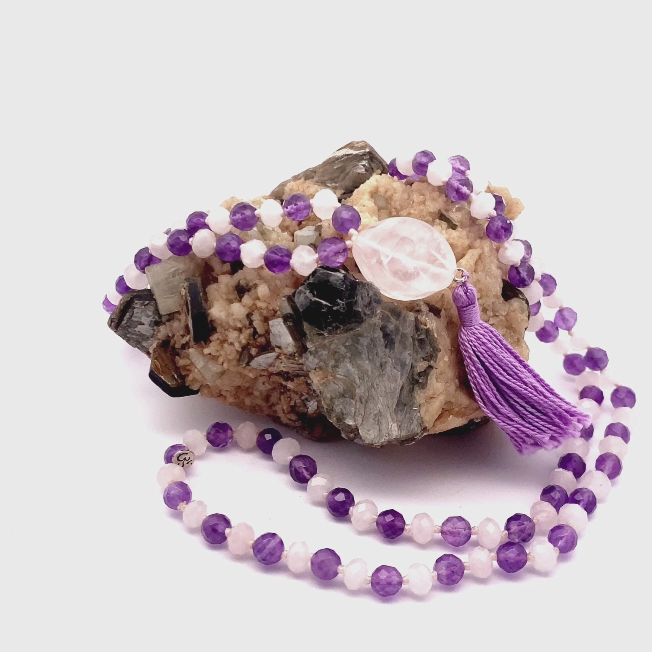 Elevate your spiritual practice and clear your inner vision with the Infinite Peace Mala, a masterfully handcrafted accessory designed to activate and balance your Third Eye Chakra. Featuring a harmonious blend of Rose Quartz and Amethyst, this mala is expertly created to clear mental clutter, enhance intuitive insight, and nurture a profound sense of inner peace. Strung on durable artificial thread with a tassel, its timeless design seamlessly merges ancient spiritual traditions with modern elegance—making it the perfect companion for meditation, energy work, or as a meaningful everyday accessory.