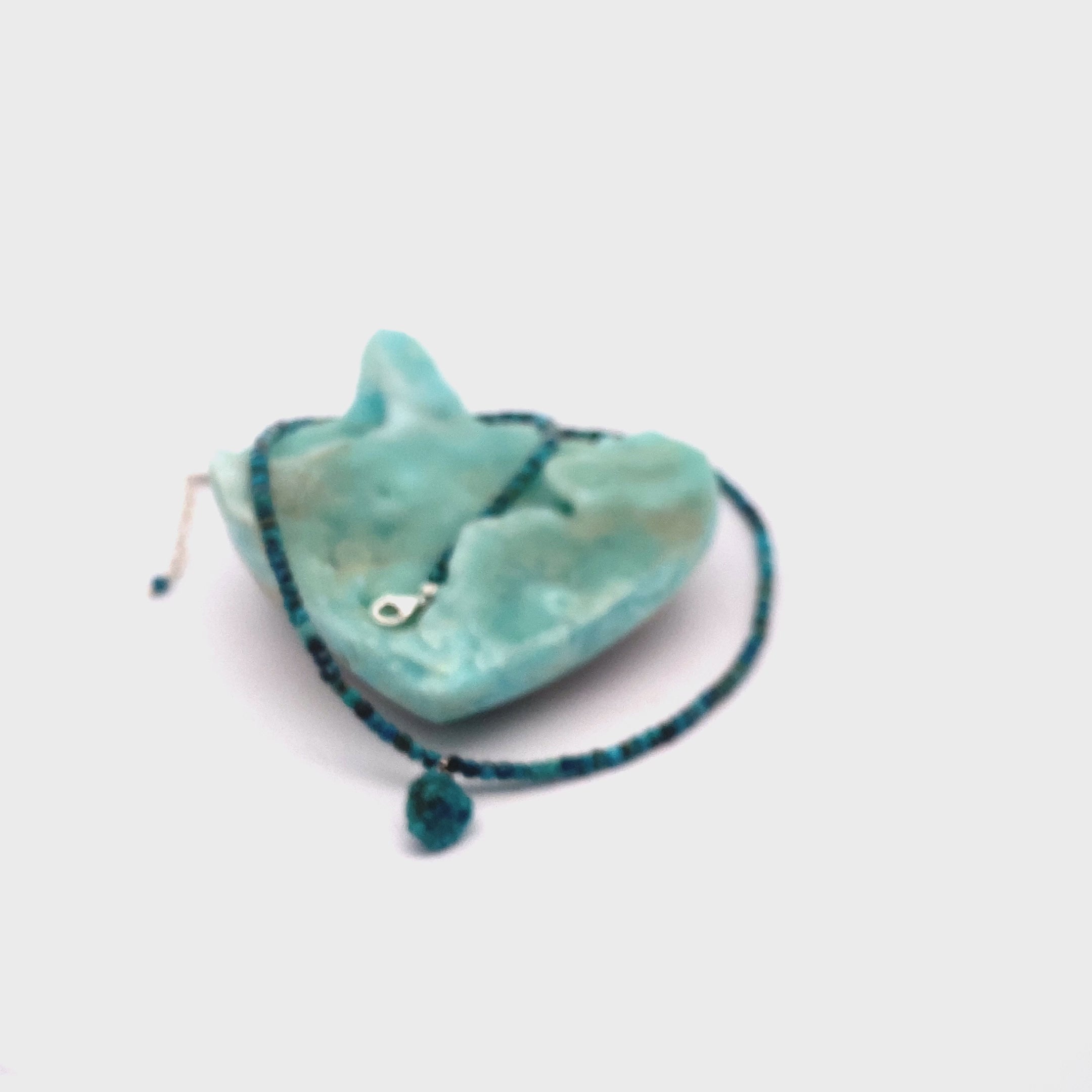 Enhance your heart, throat chakra with our Inner Strength necklace, handcrafted with Chrysocolla, Pendant Turquoise for spiritual balance and healing. This short necklace promotes heart, throat chakra alignment and encourages emotional stability and well-being.