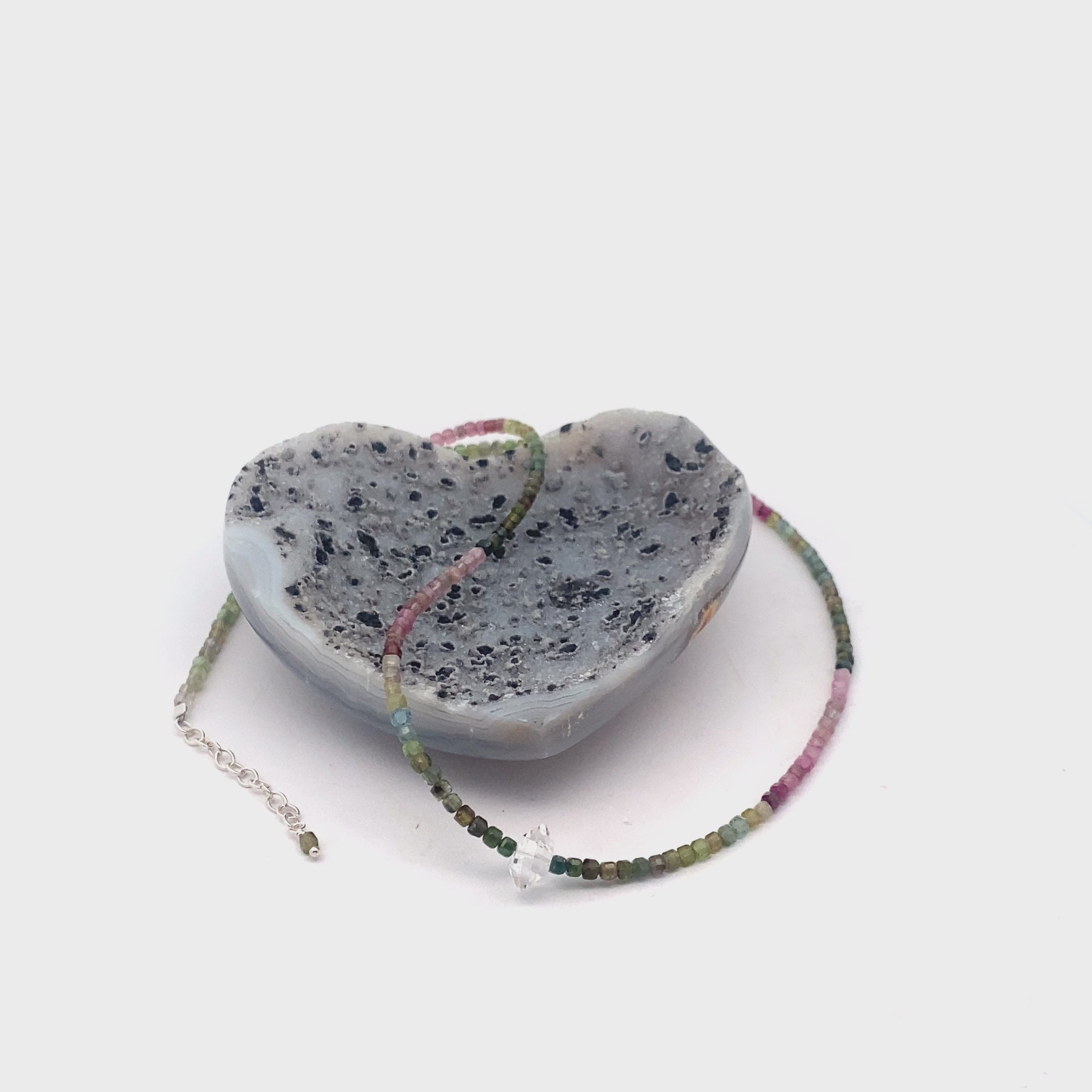 Enhance your seven chakra with our Mental Healer necklace hand crafted with Tourmaline and Herkimer Diamond for spiritual balance and healing. This short necklace promotes seven chakra alignment and encourages emotional stability and well-being.