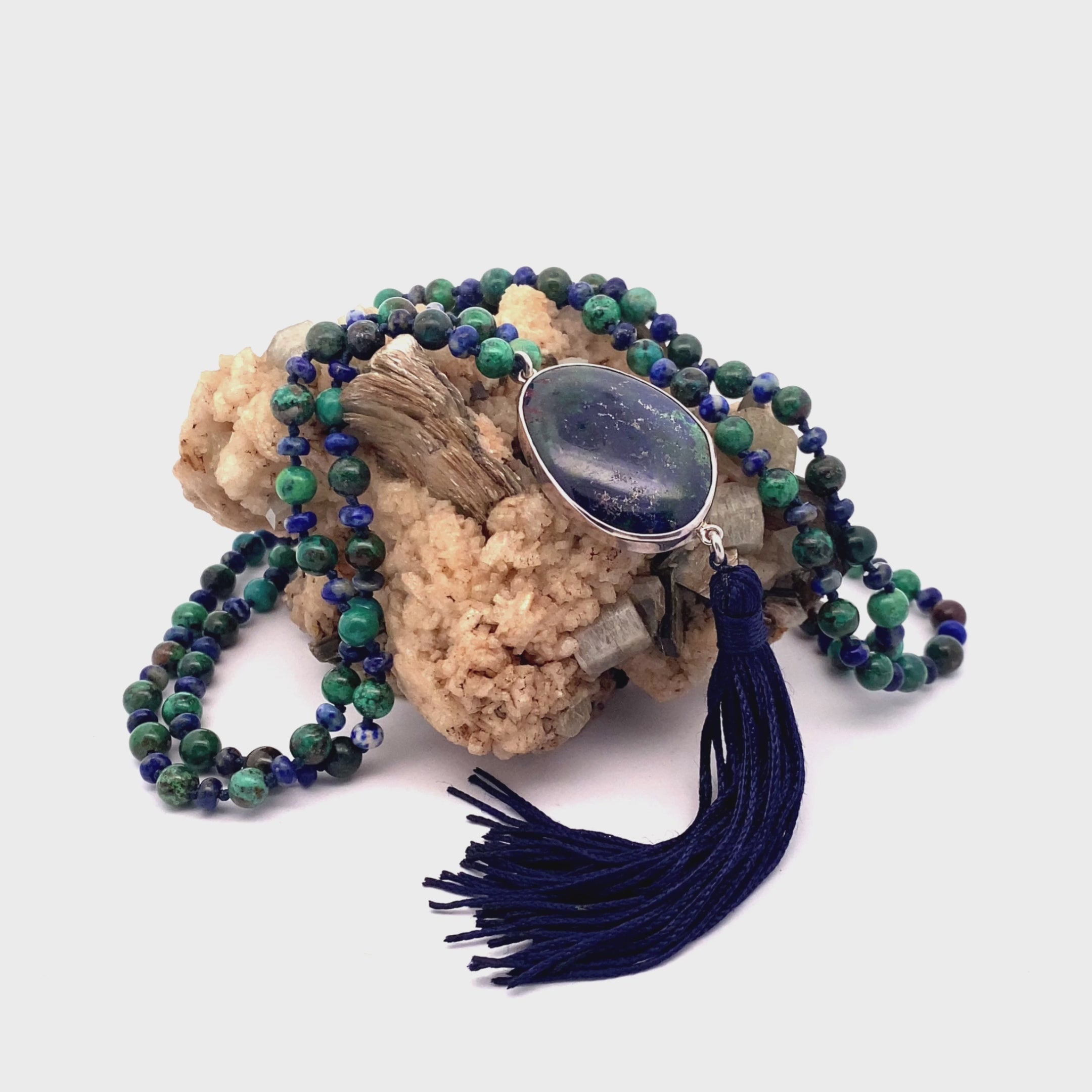 Unlock your inner voice and enhance your ability to communicate with authenticity using the Opening the Throat Chakra Mala. This masterfully handcrafted mala is designed to activate and balance your Throat Chakra, clearing energy blockages and fostering open, honest self-expression. Featuring a high-vibrational blend of Lapis Lazuli, Chrysocolla, and Azurite, this mala nurtures mental clarity and encourages a confident, articulate presence. Strung on durable artificial thread with a tassel, its timeless design seamlessly merges ancient spiritual wisdom with modern elegance—making it the perfect companion for meditation, energy healing, or as a daily reminder to speak your truth.