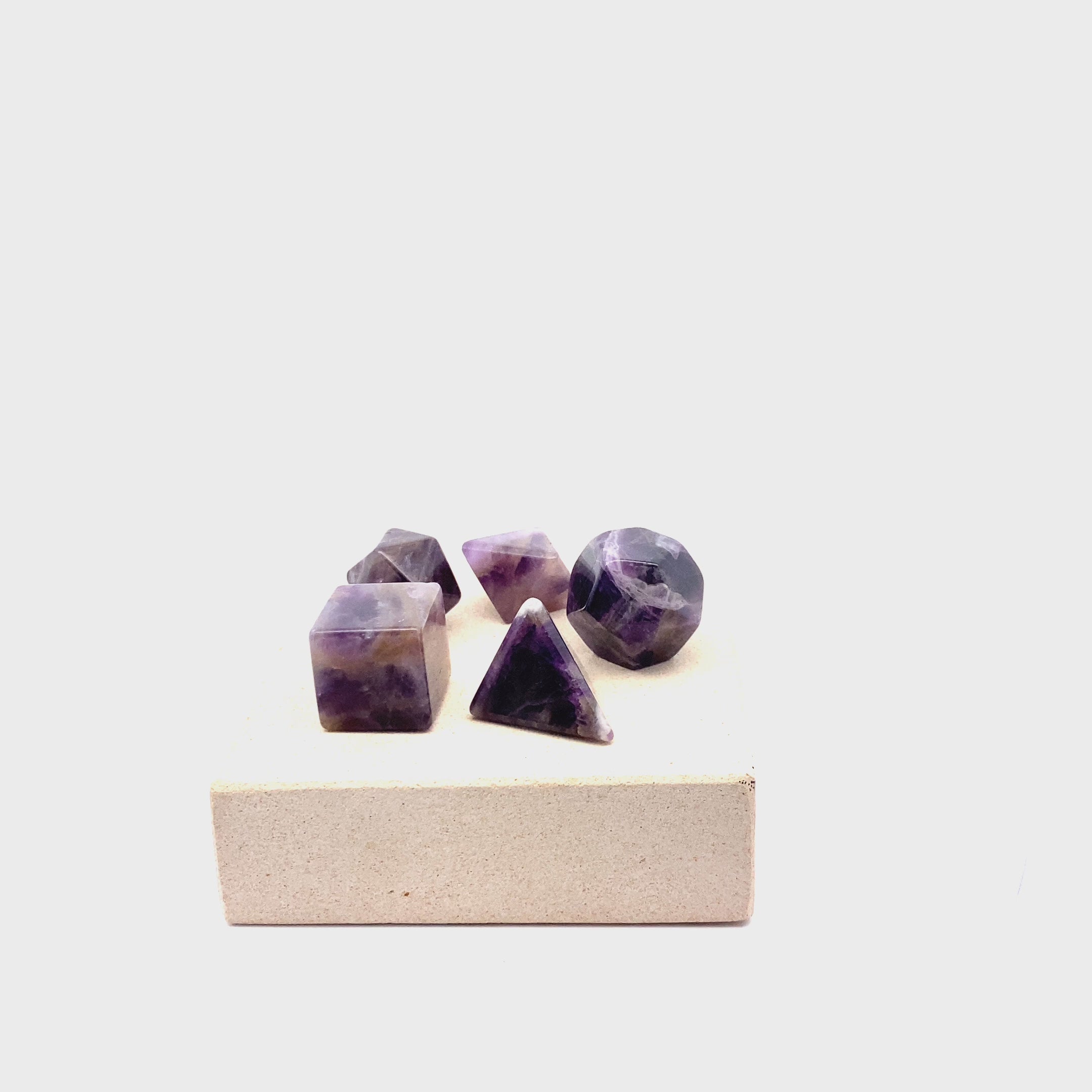 Platonic Solid, Amethyst shaped into sacred geometric shapes, in hard paper box