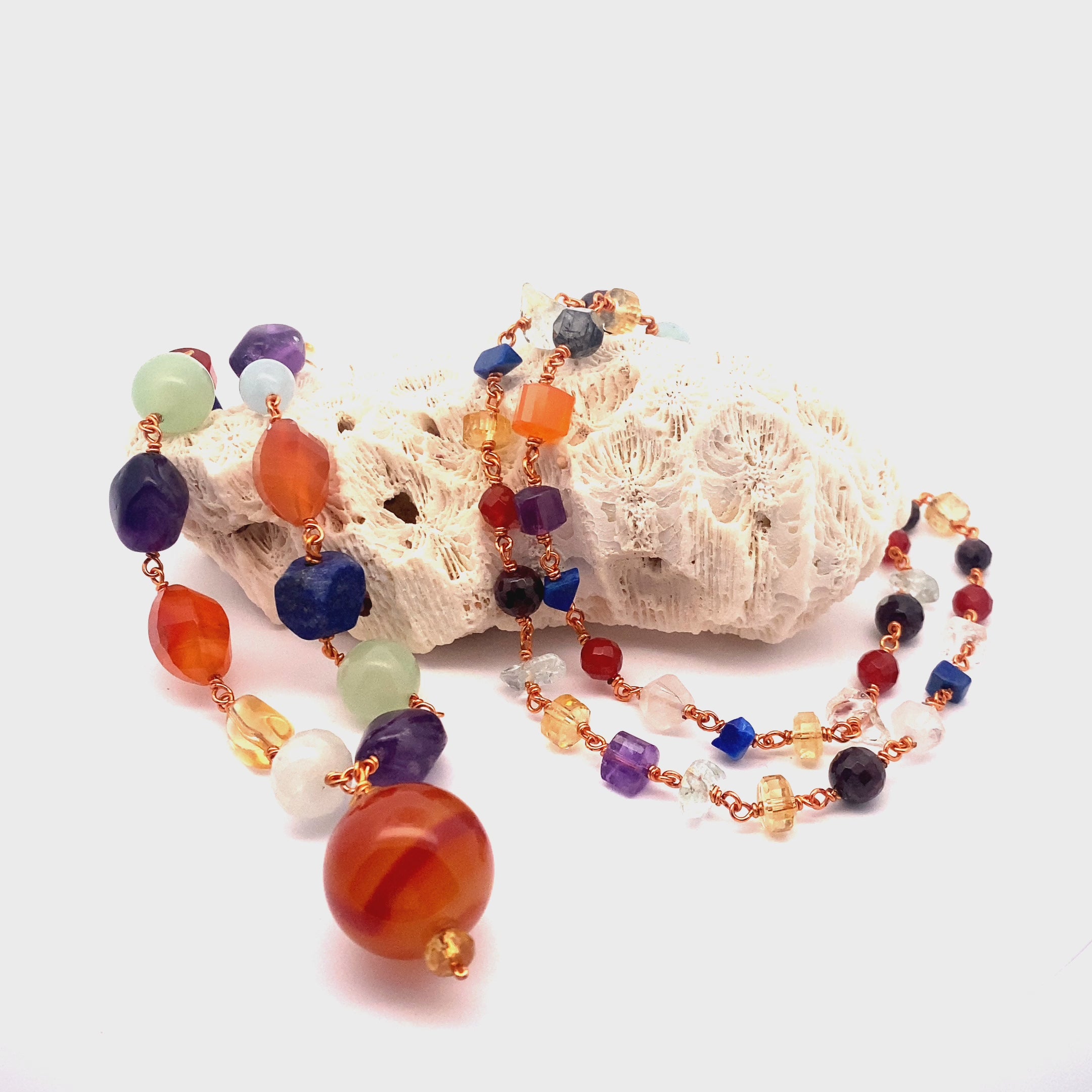 Harness the power of the 7 Chakra Necklace Copper, a stunning long necklace designed to balance and activate all seven chakras. Featuring a unique blend of Garnet, Carnelian, Citrine, Jade, Amethyst, Tourmalinated Quartz, Aquamarine, and Lapis Lazuli, this piece enhances energy flow, emotional stability, and spiritual clarity.