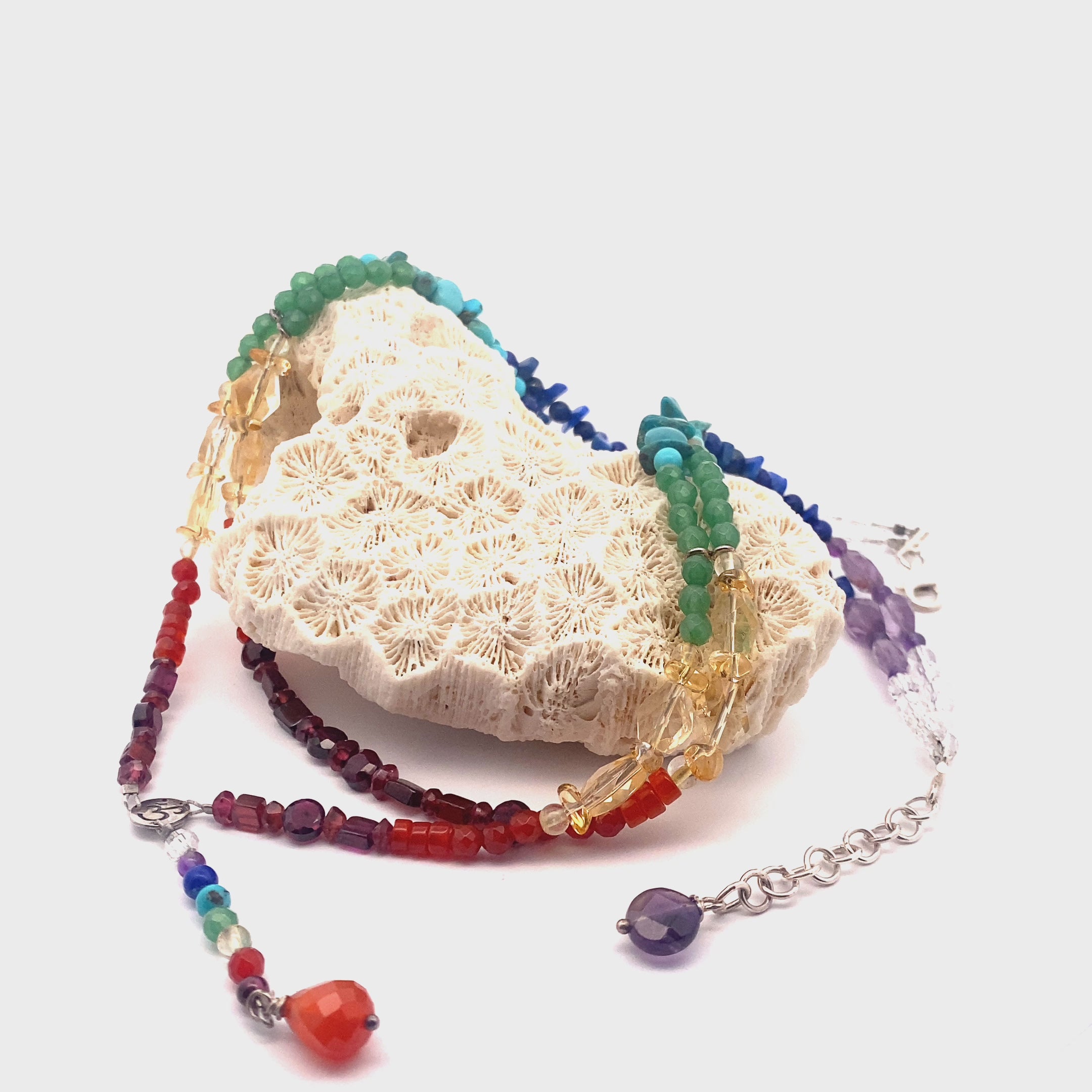 Embrace harmony and positive energy with the 7 Chakra Short Necklace, a beautifully handcrafted piece designed to align and activate all seven chakras. Featuring a vibrant selection of Carnelian, Garnet, Citrine, Aventurine, Lapis Lazuli, Turquoise, and Crystal Clear Quartz, this necklace enhances vitality, emotional clarity, and spiritual connection.