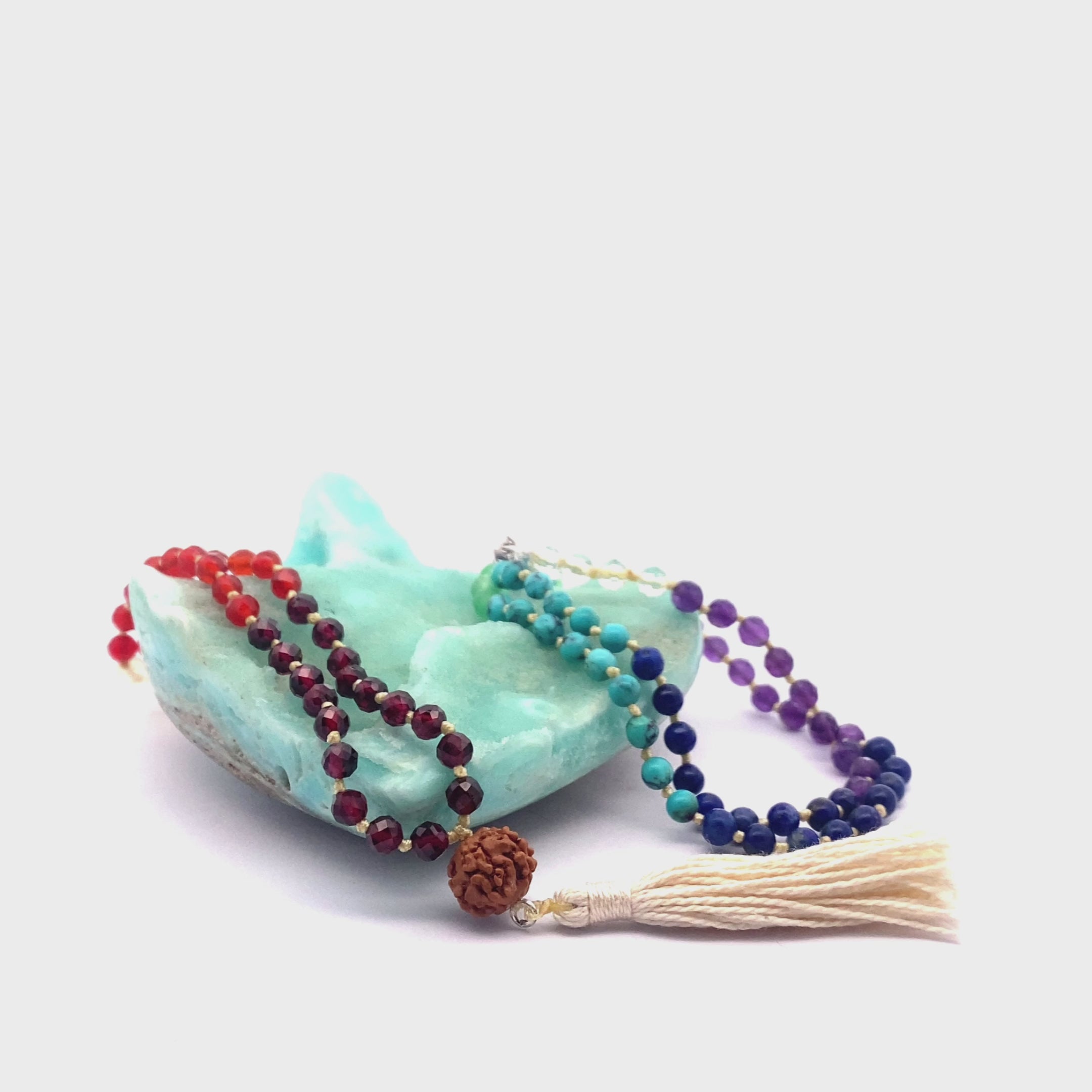 Introduce balance and positive energy into your child's life with the 7 Chakra Mala x Short, a beautifully handcrafted necklace designed to activate and harmonize all seven chakras. Featuring a vibrant blend of Garnet, Carnelian, Citrine, Aventurine, Turquoise, Amethyst, Lapis Lazuli, Crystal Clear Quartz, and Rudraksha, this necklace is created to support emotional well-being, enhance focus, and promote a sense of calm. Strung on durable artificial thread with a tassel, its lightweight and comfortable design makes it the perfect spiritual companion for meditation, mindfulness, or daily wear.