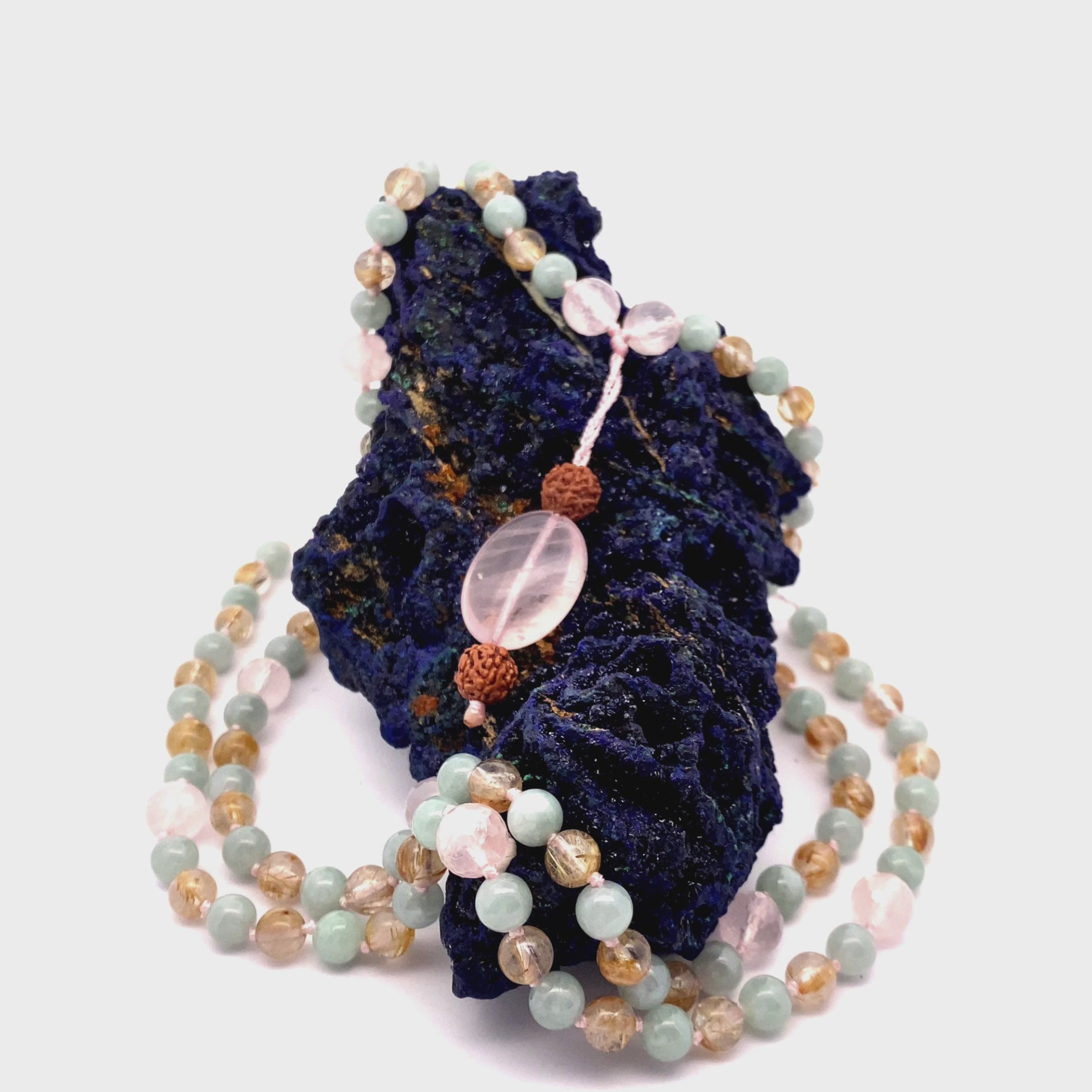 Embrace a life of love, prosperity, and emotional balance with the Tibetan Mala Laksmi, a meticulously handcrafted mala designed to activate and harmonize your Heart Chakra. Featuring a sacred blend of Rutilated Quartz, Jade, Rose Quartz, and Rudraksha, this mala is expertly created to clear energy blockages, nurture compassion, and invite the abundant energy of love and prosperity into your life. Strung on durable artificial thread, its timeless design seamlessly fuses ancient Tibetan spiritual traditions with modern elegance—making it the perfect companion for meditation, mantra recitation, energy healing, or as a meaningful everyday accessory.