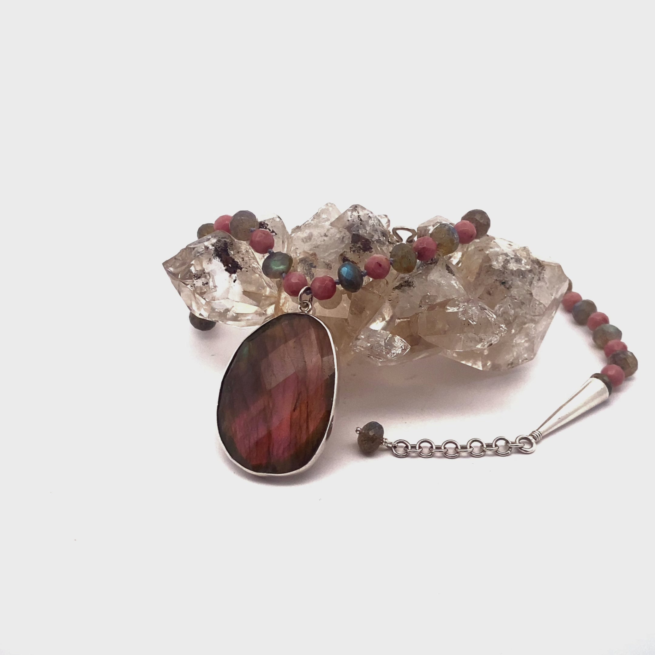 Elevate your inner voice with the Universal Energy Short Necklace, a masterfully handcrafted accessory designed to activate and balance your Throat Chakra. Featuring a dynamic blend of Labradorite and Rhodonite, this necklace is expertly created to clear energy blockages, inspire clear, heartfelt communication, and awaken your intuitive expression. Crafted on durable artificial thread and accented with premium 925 sterling silver chains, its timeless design seamlessly fuses ancient spiritual wisdom with modern elegance—making it the perfect companion for meditation, energy work, or as a meaningful everyday accessory.
